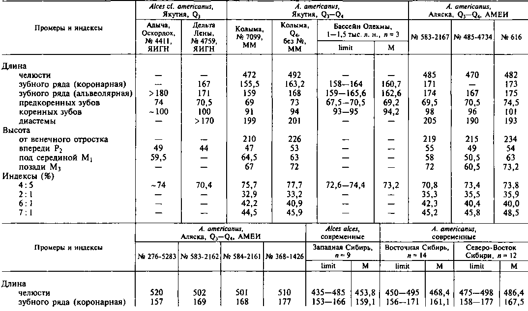 Н.К. Верещагин [1967; Верещагин, Русаков, 1979] отмечал, что некоторые рога плейстоценовых лосей из Западной Украины и Среднего Поволжья (кроме лося Савина) чрезвычайно похожи на рога современных колымских и аляскинских лосей. Анализируя это обстоятельство, данный автор констатировал, что «в плейстоцене географическая изменчивость лосиных популяций была иная, чем ныне» [Верещагин, Русаков, 1979]. Нам же представляется более вероятным, что американские лоси, более приспособленные к холодному климату, чем европейские, в позднем плейстоцене в составе мамонтовой фауны были распространены гораздо шире в Евразии, чем в настоящее время, заселяли Западную Сибирь и даже часть Восточной Европы.