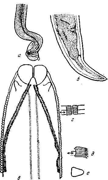 а — головной конец латерально; б — головной конец дорзально; в — задний конец самца