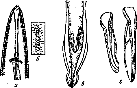 а — головной конец; б — фрагмент канатика; в — задний конец самца; г — спикулы