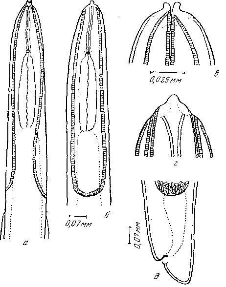 а — передний конец дорзально; б — передний конец лате-ральио; в — головной конец дорзально; г— головной конец латерально; д — хвостовой конец самки