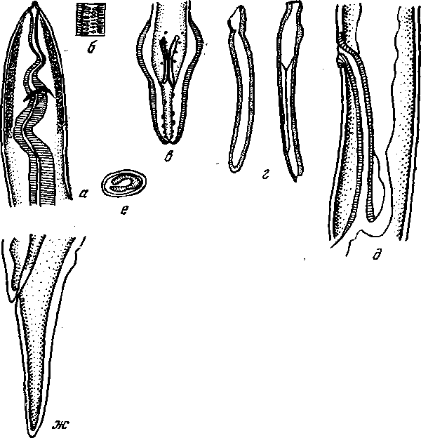 а — головной конец; б — фрагмент канатика; в — задний конец самца; г — спикулы; д — область вульвы; е— яйцо; ж — хвостовой конец самки