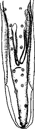Самец. Длина тела самцов колеблется в пределах 9—11 мм. Хвост длинный и сужающийся, длина его 0,122—0,138 мм; он всегда свернут в спираль. Хвостовые крылья широкие и исчерченные. Они поддерживаются четырьмя парами преанальных и пятью парами постанальных сосочков. Все они стебельчатые; задние сосочки имеют тенденцию располагаться асимметрично. Спикулы неравные и неодинаковые. Правая толстая и мощная имеет вентральное крыло 0,200 —0,234 мм. Передний конец спикулы загибается под прямым углом, задний — тупой. Левая спикула длинная и тонкая, сужается дистально. Длина ее колеблется от 0,484 до 0,520 мм.