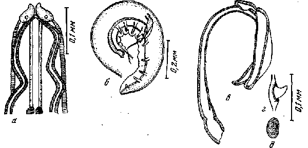 a — головной конец; б — задний конец самца; в — спикулы; г — цервикальный сосочек; д — яйцо