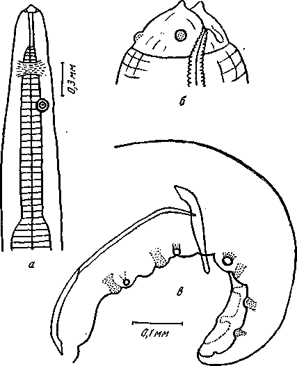 У заднего конца каждого крыла расположено по одному маленькому округлому сосочку. Длинная спикула достигает 0,51 мм; проксимальный конец ее трубчатый, дистальный—суженный. Короткая спикула 0,18 мм длины, плоская, с тупым концом.