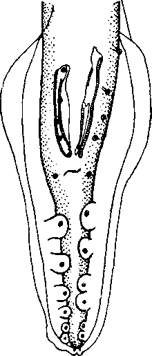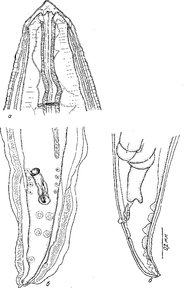 a — головной конец; б — хвостовой конец самца; в — хвостовой конец сайки