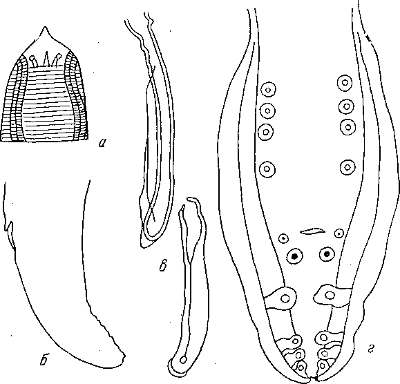 а — головной конец; б — хвостовой конец самки; в — спикулы; г — хвостовой конец самца
