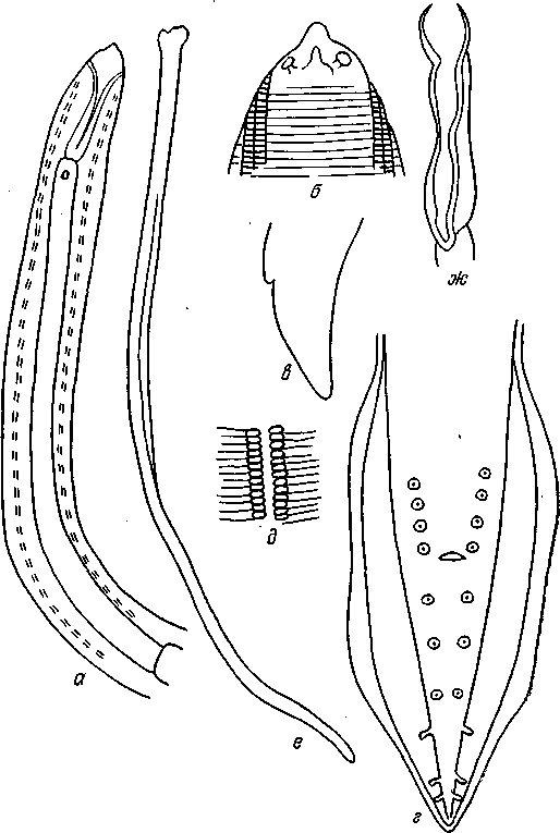 (а, б, в, д — по Жандру, 1912; г, е, ж — по Жандру, 1913) а — передний конец; б — головной конец; в— хвостовой конец самки; г— хвостовой конец самца; д — фрагмент канатиков; е, ж — спикулы
