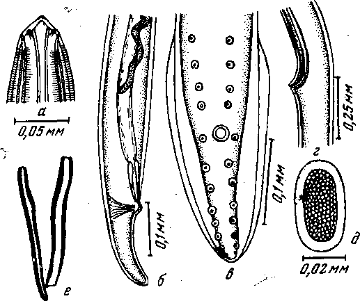 а — головной конец; б — хвостовой конец самки; в — хвостовой конец самца; г — область вульвы; д — яйцо; е — спикулы