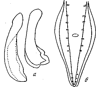 Левая спикула 0,16 мм длины и 0,019 мм ширины, с глубоким желобком на большей части своей длины. Правая спикула 0,141 мм длины и 0,017 мм ширины, со слабым желобком на конце. Обе спикулы сильно искривлены в вентральную сторону.