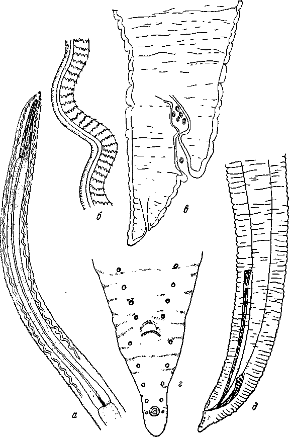 а — передний конец; б— фрагмент канатика; в— задний конец самки; г — хвостовой конец самца вентрально; д — задний конец самца латерально