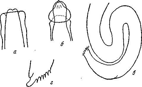 а — головной конец дорзально; б — головной конец латерально; в — задний конец; а — хвостовой конец