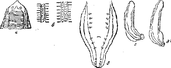 а — головной конец; б — канатики; в — хвостовой конец самца; з, д — спикулы