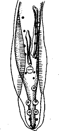 Самец. Тело достигает 4,7 мм длины при максимальной ширине 0,14 мм. Кутикула поперечно исчерчена с интервалами, равными 0,005 мм. Длина канатиков 0,22 мм. Фаринкс 0,145 мм длины, мышечный пищевод—0,35 мм, а железистый — 0,75 мм. Нервное кольцо отстоит от переднего конца тела на расстоянии 0,170 мм, экскреторное отверстие на расстоянии 0,22 мм. Длина правой спикулы достигает 0,11, а левой — 0,17 мм. Хвостовой конец 0,16 мм длины.