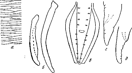 а — фрагмент канатика; б — спикулы; в — хвостовой конец самца; г, д — хвостовые концы самок