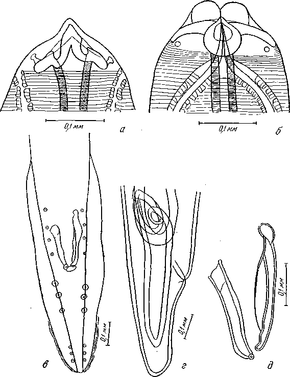 а — головной конец латерально; б — головной конец дорзально; в — хвостовой конец самца; г —хвостовой конец самки; д — спикулы
