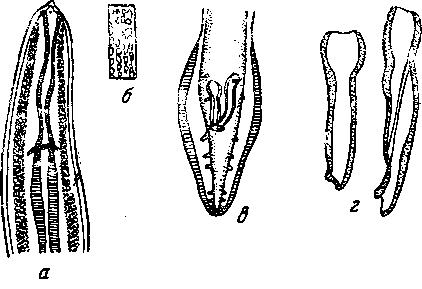 а — головной конец; б — фрагмент канатика; в — задний конец самца; г — спикулы