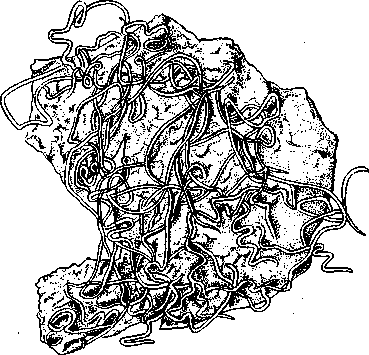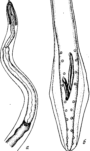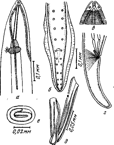 а — передний конец; б — хвостовой конец самца; в — головной конец; г — хвостовой конец самки; д — спикулы; е — яйцо