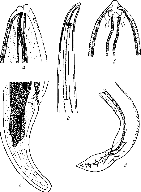 а - передний конец; б — спикула; в — хвостовой конец самки; г—. фрагмент канатика