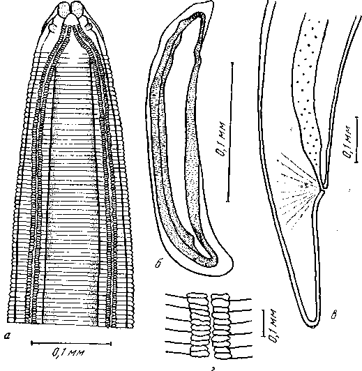 a — головной конец дорзально; б — передний конец; в— головной конец латерально; г — задний конец самки; д — задний конец самца