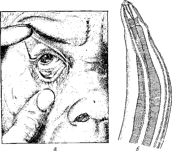 а — Acuaria sp. на нижнем веке глаза; б —фрагмент нематоды Acuaria sp., извлеченной из глаза
