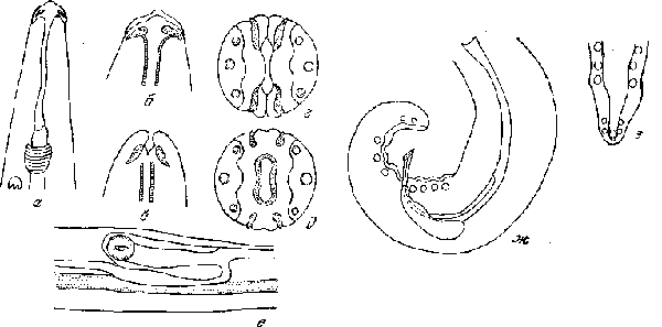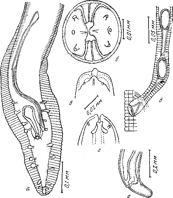 а — задний конец самца; б — головной конец апикально; в — головной конец латерально (губы отмечены пунктиром); г — головной конец вентрально; д — яйцемет; е —- хвостовой конец самки