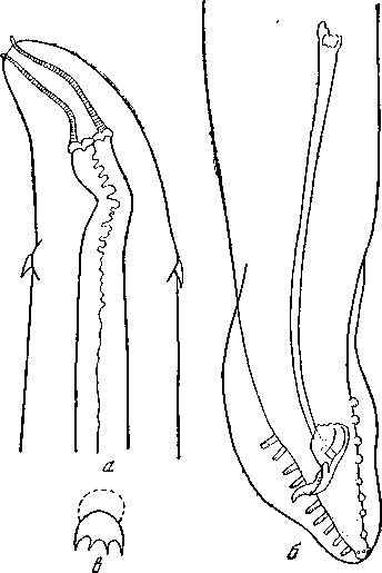 а — головной конец; б — задний конец самца, в — цервикальный сосочек
