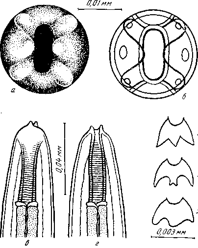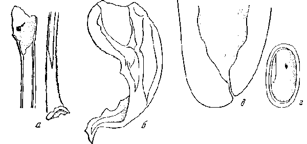 a — проксимальный и дистальный концы большой спикулы; б — малая спикула; в — хвостовой конец самки; г — яйцо