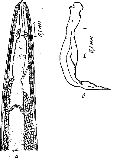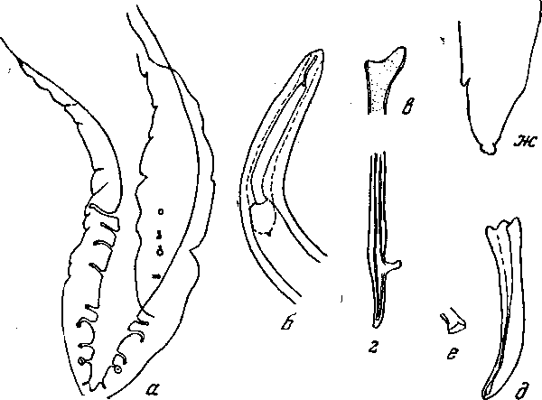 a — задний конец самца; б — передний конец; в — проксимальный конец левой спикулы; г — дистальный конец левой спикулы; д — правая спикула; е — Дистальный конец правой спикулы; ж — хвостовой конец самки