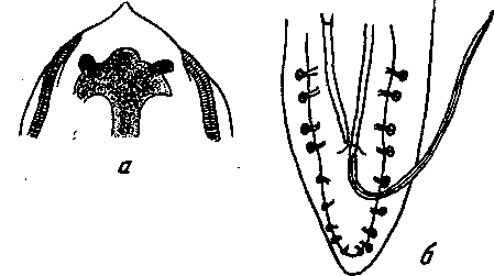 а — головной конец; б — хвостовой конец самца