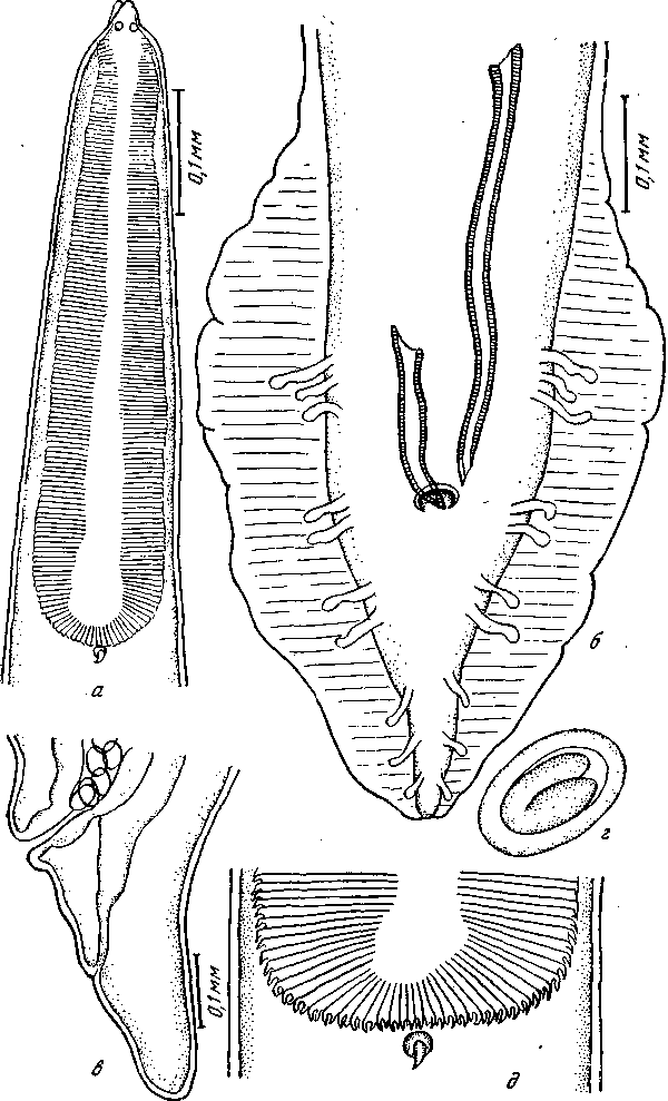 а - передний конец; б — задний конец самца; в — задний конец самки; г — яйцо; д — фрагмент канатиков и цервикальный сосочек