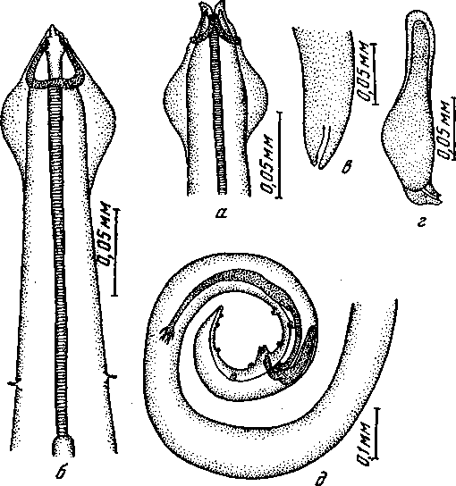 а — головной конец дорзально; б — передний конец латерально; в — правая спикула; г — дистальный конец левой спикулы; д — задний конец самца