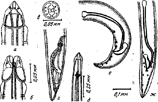 а - головной конец латерально; б — головной конец вентрально; в — головной конец апикально; задний конец самки; д — передний конец латерально; е — задний конец самца латерально; ж — задний конец самца вентрально
