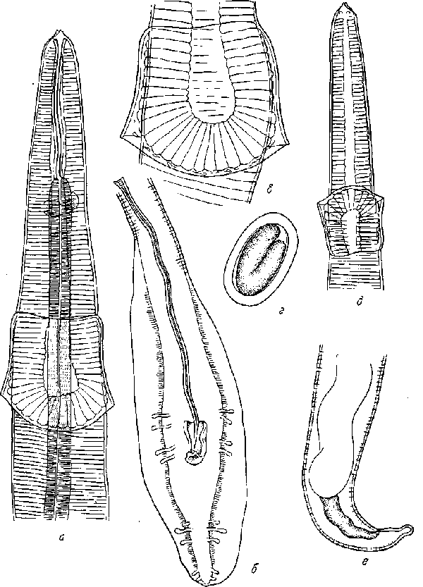 a — головной конец латерально; б — задний конец самца; в — фрагмент канатика; г — яйцо; д — головной конец дорзально; е — хвостовой конец самки