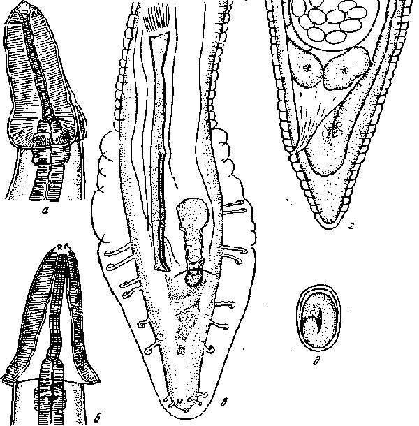 а - головной конец латерально; б— головной конец дорзально; в — задний конец самца; г — задний конец самки; д — яйцо