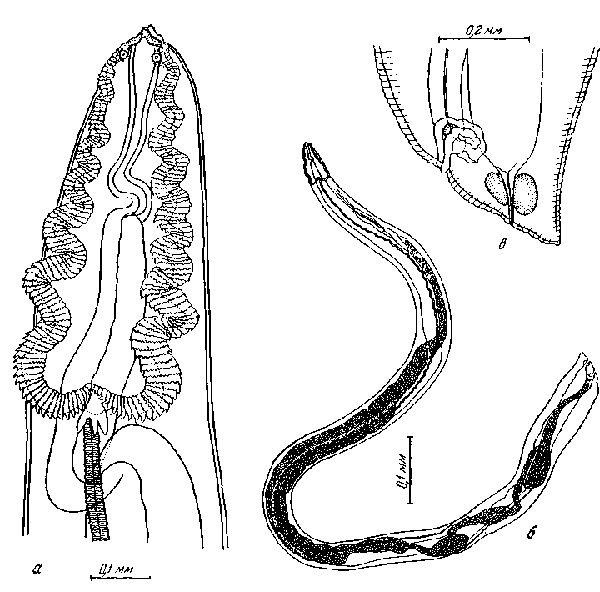 а — головной конец самки; б —. общий виц самки; е — хвостовой конец самки