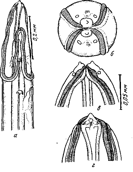 а —передний конец латерально; б— головной конец апикально: в— головной конец дорзально; г — головной конец латерально
