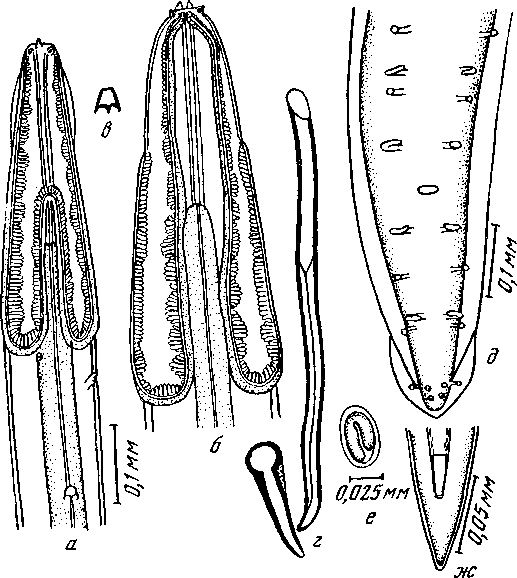 а — головной конец самца латерально; б — головной конец самки вентрально; в —шейный сосочек; г — спикулы; д — хвостовой конец самца; е — яйцо; ж — хвостовой конец самки