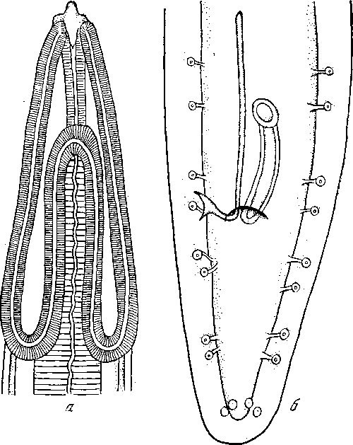 а — передний конец латерально; б — задний конец самца