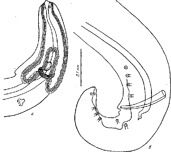а — головной конец; б — хвостовой конец самца