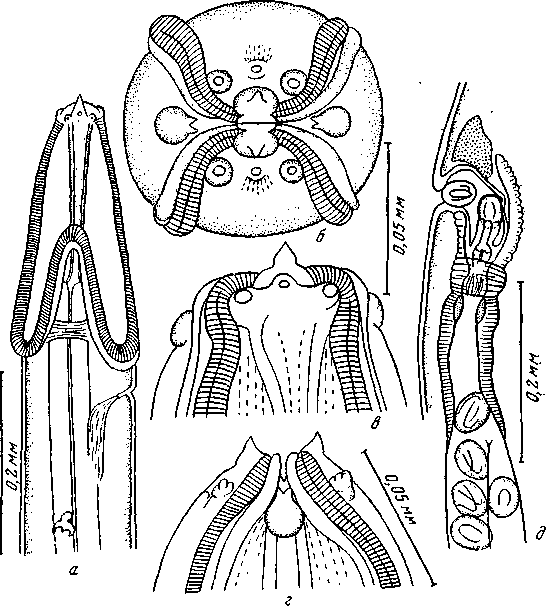 a — передний конец; б — головной конец апикально; в — головной конец латеральног е — головной конец дорзально; 9 •— область вульвы
