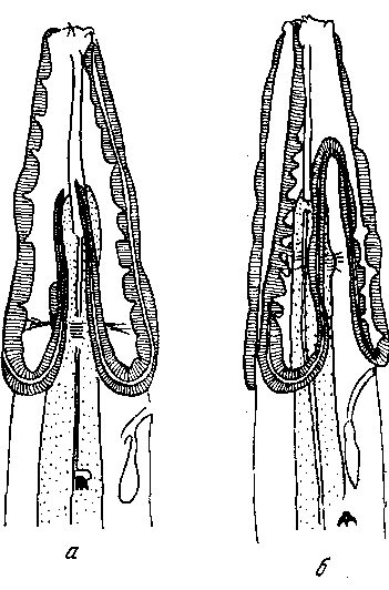 Передний конец тела снабжен четырьмя возвращающимися канатиками, мало извилистыми в том случае, если паразит нормально вытянут; канатики эти анастомозируют попарно на латеральных сторонах тела. Эти канатики проходят в довольно глубоких выемках кутикулы. Две маленькие латеральные, треугольной формы губы заканчиваются спереди небольшим апикальным зубчиком, вершина которого игловидной формы. Сразу позади соединений губ и между передними концами канатиков имеются дорзальный и вентральный выступы, слегка раздвоенные спереди хорошо заметные в латеральном и медианном положении.