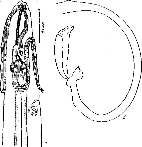 Спикулы две, неравные. Большая спикула 0,744 мм длины и 0,018 мм ширины, дистальный конец ее сильно вздут, а самый кончик раздвоен. Короткая спикула 0,155 мм длины и 0,034 мм ширины.
