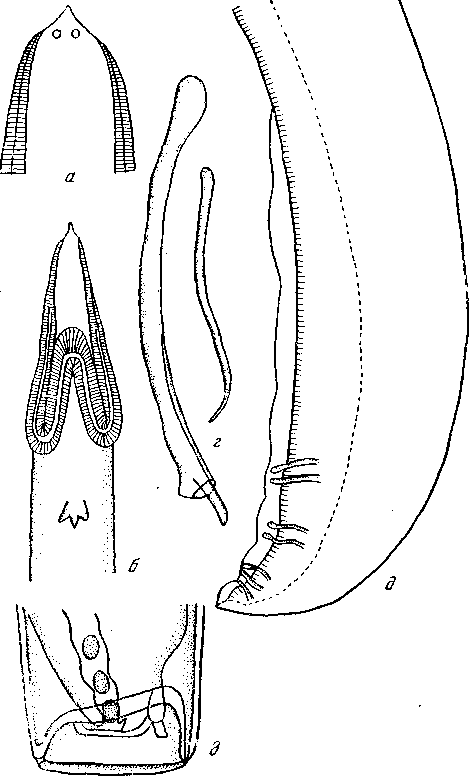 а, б — головной конец самки латерально; в — хвостовой конец самки; г — спикулы; д — хвостовой конец самца