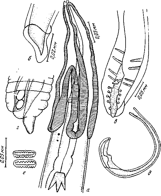 a — передний конец; б — дистальный конец короткой спикулы; в — хвостовой конец самца; г —хвостовой конец самки; д — длинная спикула; е — деталь канатиков