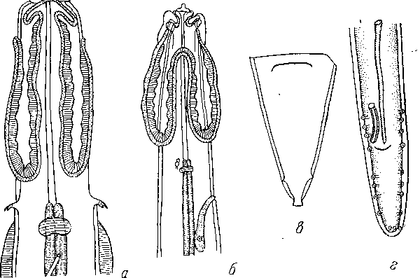 а — головной конец дорзально; б — головной конец латерально; в - хвостовой конец самки; в — задний конец самца