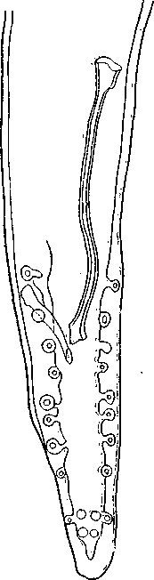 Самец. Длина тела 7—10 мм при максимальной ширине 0,27—0,29 мм. Фаринкс 0,29—0,36 мм; мышечный отдел пищевода 0,73—0,98 мм; железистый отдел —2,2—3,2 мм длины. Длина хвоста 0,26 мм. Размеры спикул даны в описании Васильковой с явной ошибкой — они противоречат рисунку. Преанальных сосочков четыре пары, постанальных шесть пар, из них одна пара сидячих, на конце хвоста (согласно рисунку Васильковой, постанальных сосочков семь пар, из них две пары сидячих).