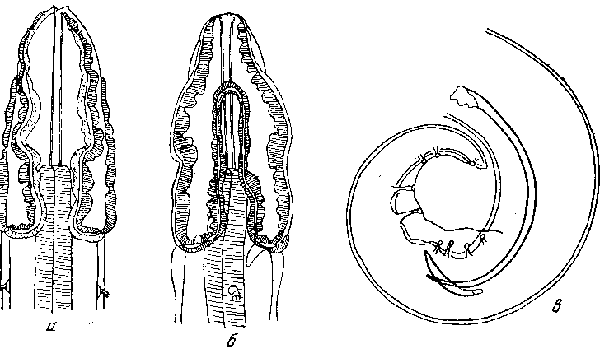 a — головной конец дорзально; б — головной конец латерально; е — задний конец самца