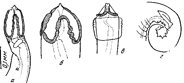 a — головной конец взрослой особи; б — головной конец молодого экземпляра длиной 6,3 мм; в — головной конец молодого экземпляра длиной 3,4 дик; г — хвостовой конец самца