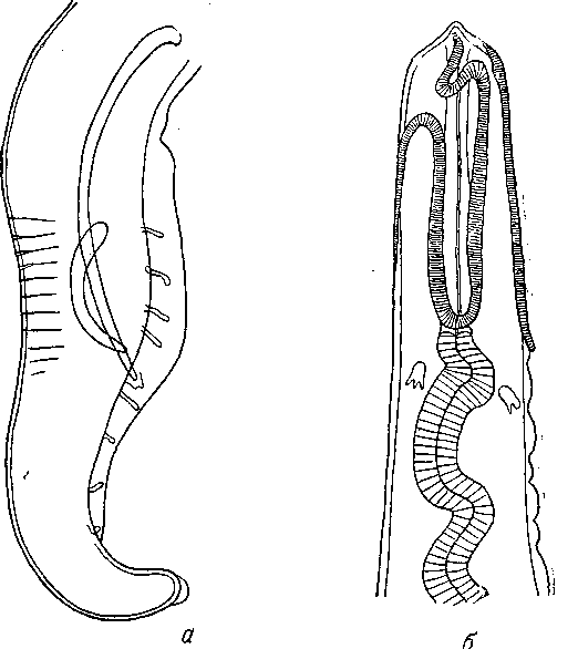 а — задний конец самца; б — передний конец