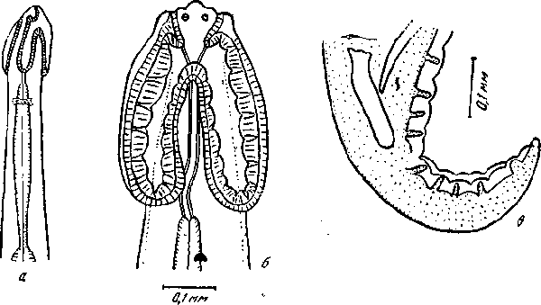 a — передний конец; б — головной конец латерально; в — хвостовой конец самца